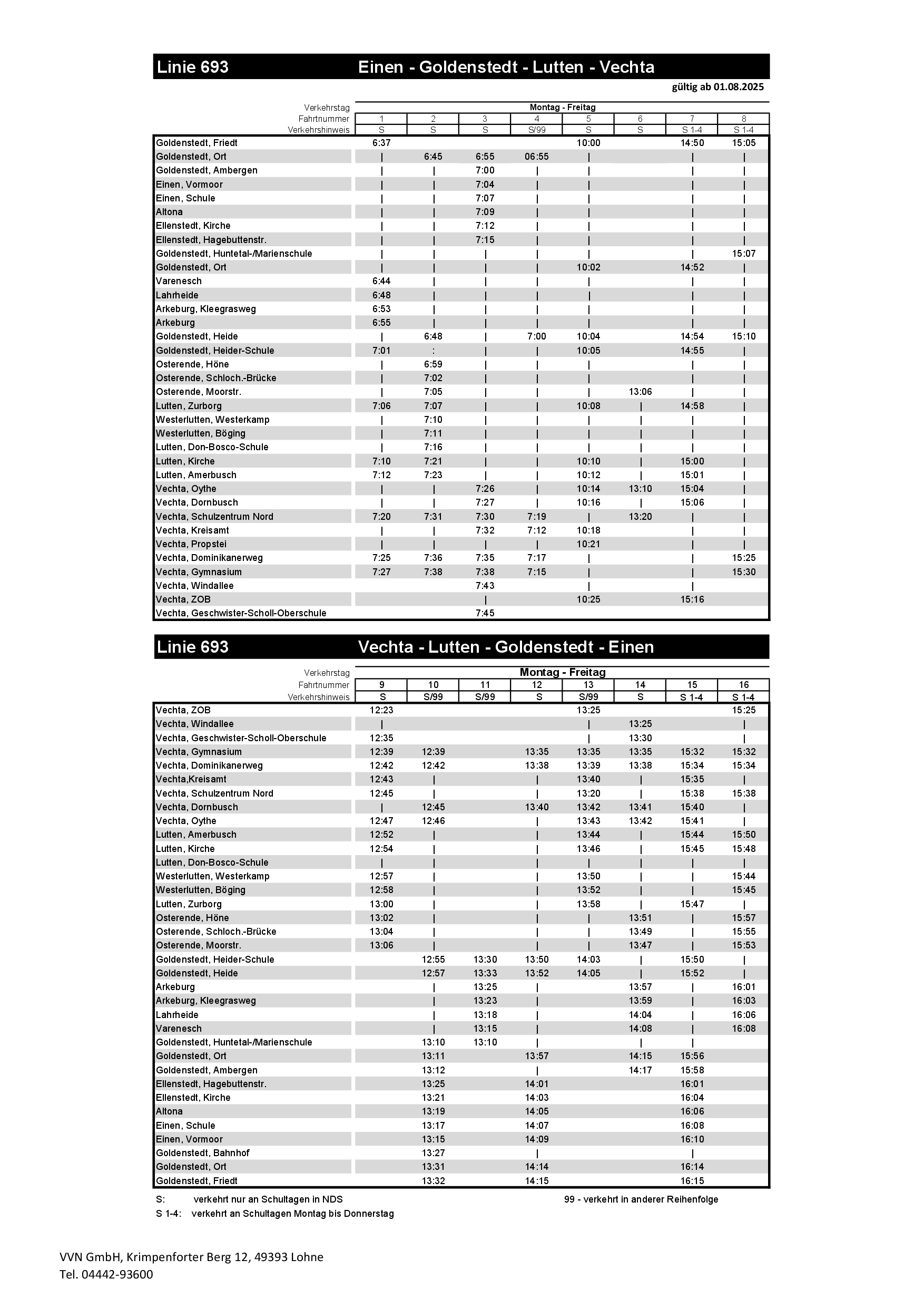 Die Abfahrtszeit der Fahrtnummer 1 der Linie 693 von Goldenstedt nach Vechta wird um 10 Minuten nach vorne verlegt.